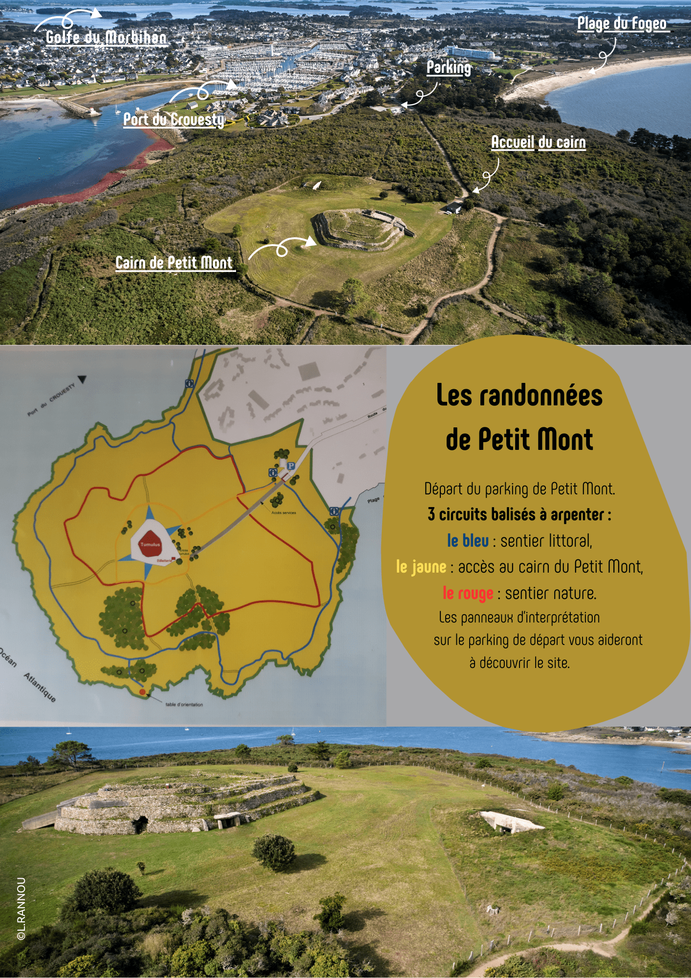Dans un environnement naturel d’une rare beauté, un “espace naturel sensible”, le cairn de Petit Mont est aussi un formidable point de départ pour se balader autour du monument, sur les sentiers côtiers, le GR34 et les plages environnantes.