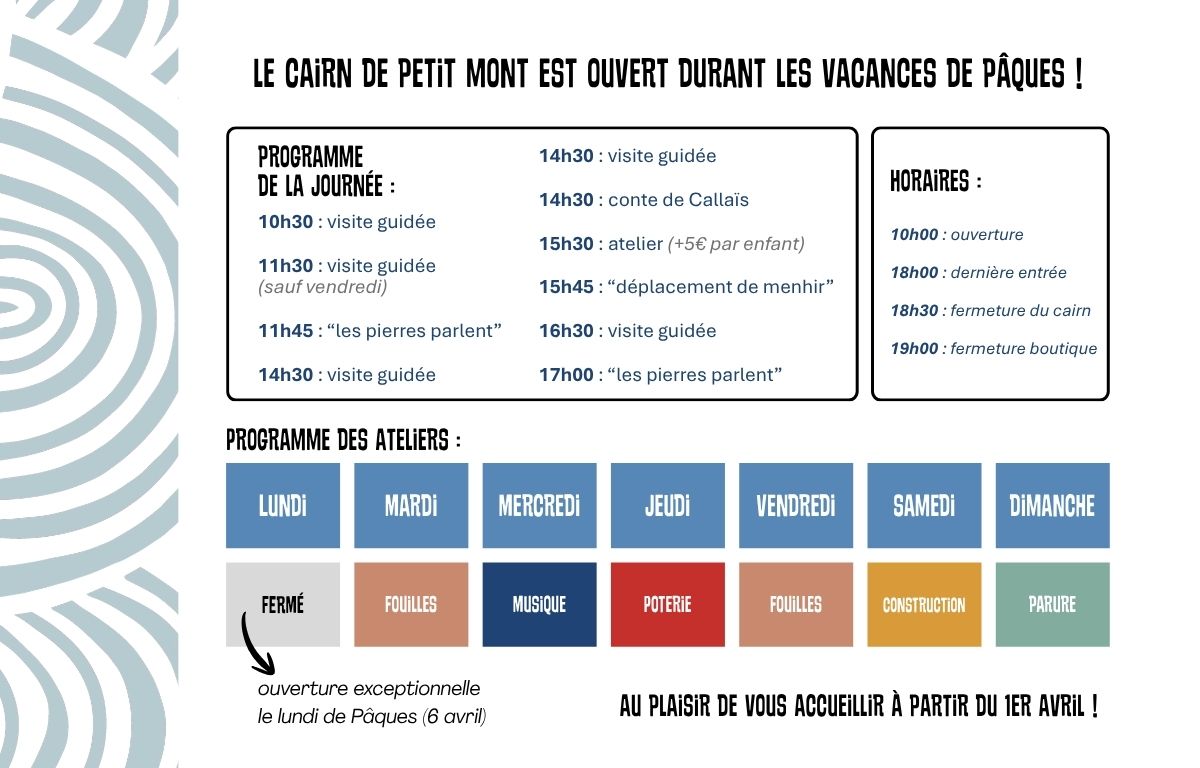 Du 4 avril au 3 mai, le cairn de Petit Mont vous accueille pour les vacances de Pâques avec un nouveau programme de visites et d’ateliers ! Nous vous accueillons tous les jours, du mardi au dimanche.