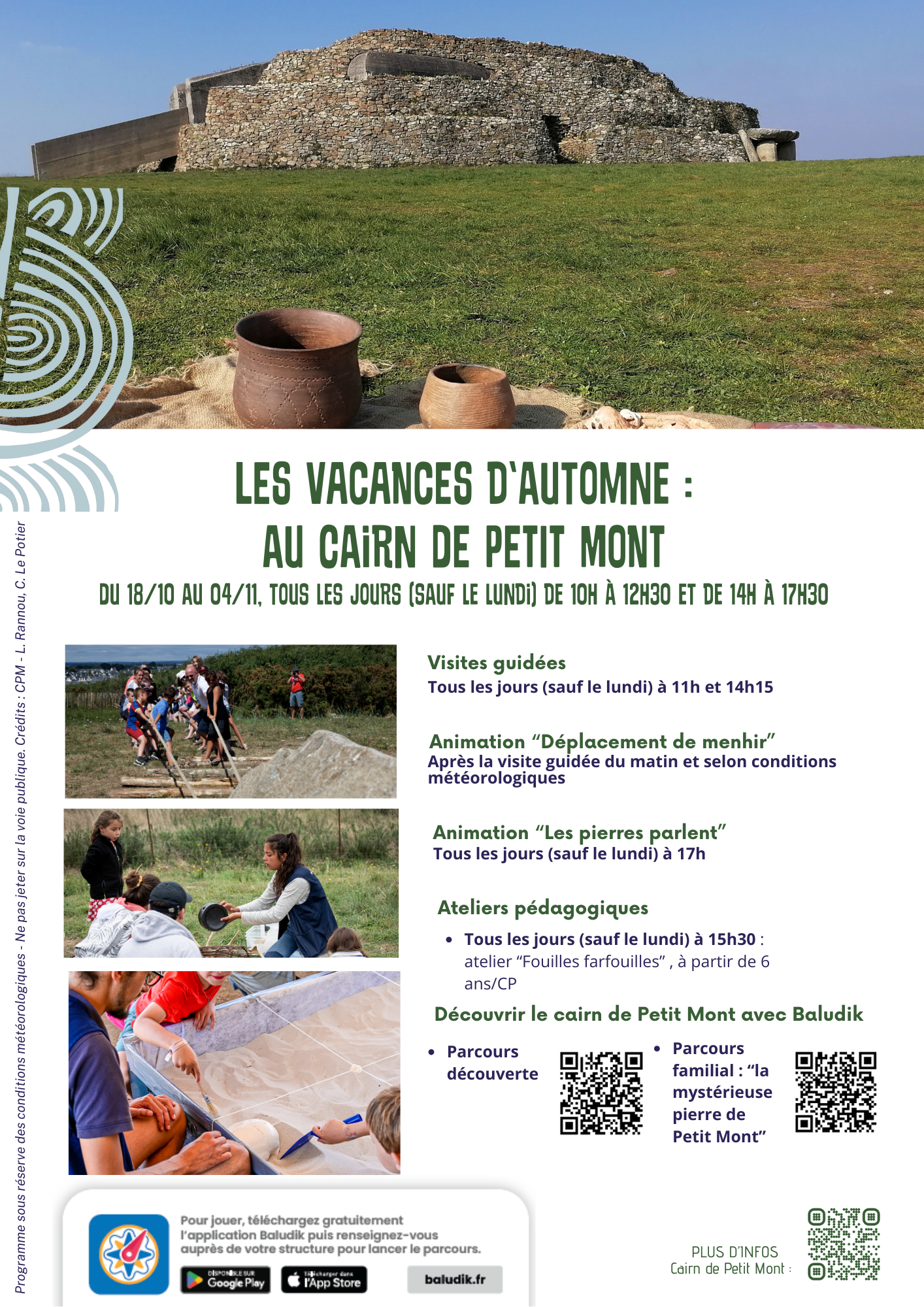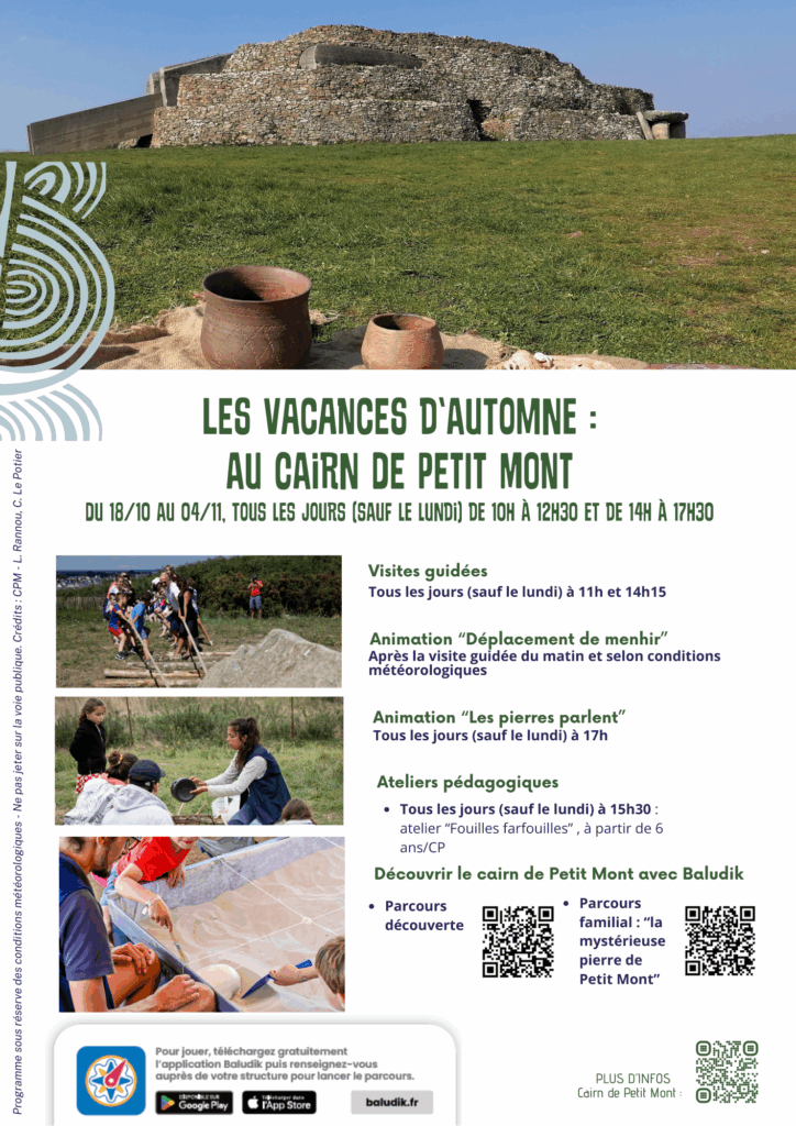 Du 18/10 au 02/11, venez profiter des couleurs d’automne et des vacances pour (re)découvrir le cairn de Petit Mont, nouvellement inscrit au patrimoine mondial de l’Unesco. Le site est ouvert tous les jours (sauf le lundi à de 10h à 12h30 et de 14h à 17h30.